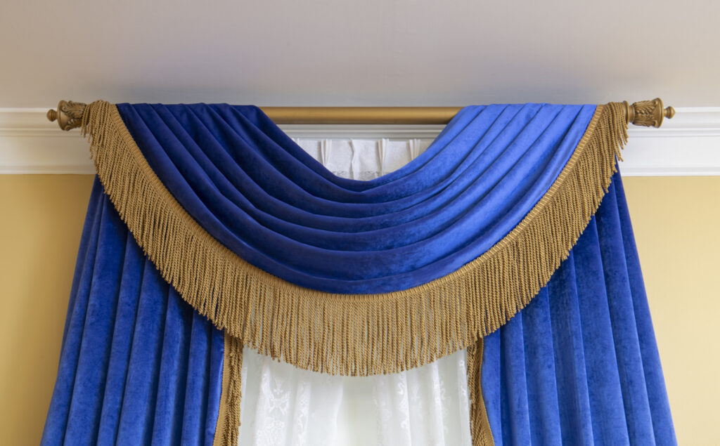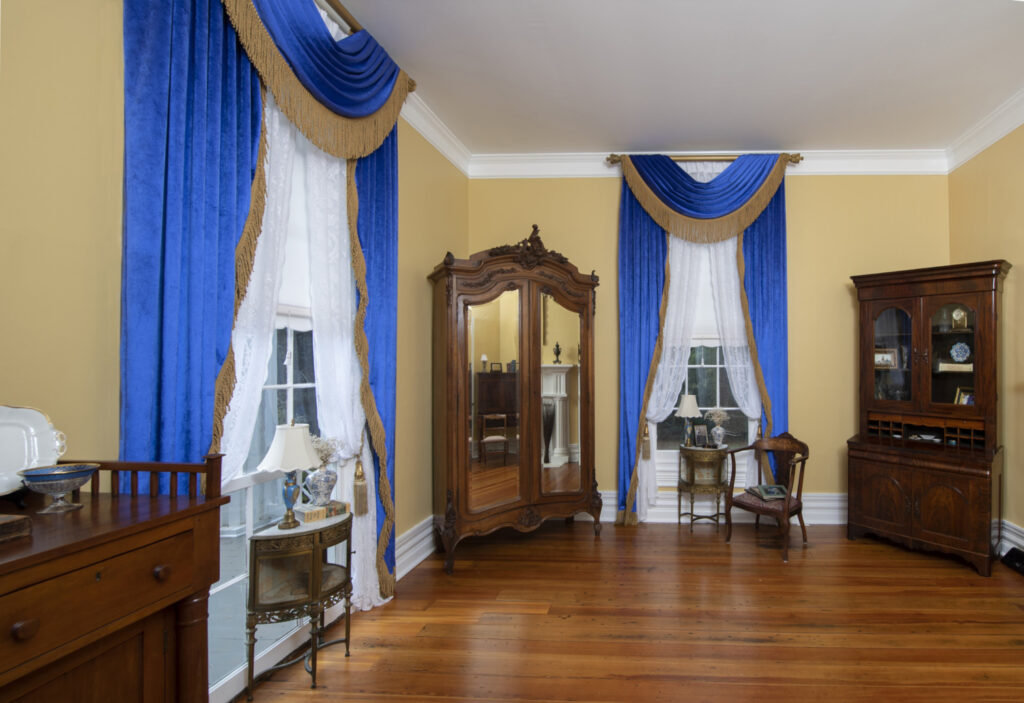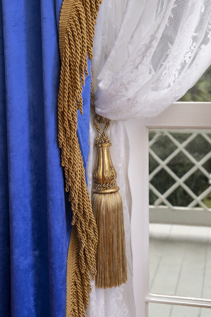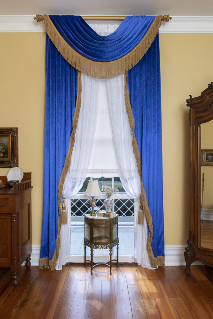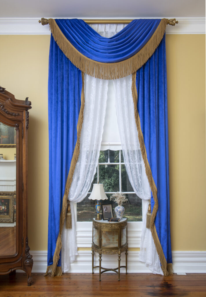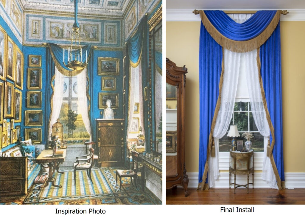 Once the historic inspiration was chosen, we began refining the design to suit this home and these rooms. We selected the colors, trim, hardware, and lace carefully so the treatments would feel both authentic and beautifully integrated into the homeowners’ renovation choices. The final composition layered royal blue velvet swags finished with gold bullion fringe, paired with lace sheers beneath to soften the light while still honoring the era. Historic style trim and finials brought the whole look together, and coordinated holdbacks ensured the sheers stayed graceful, tailored, and true to the period.