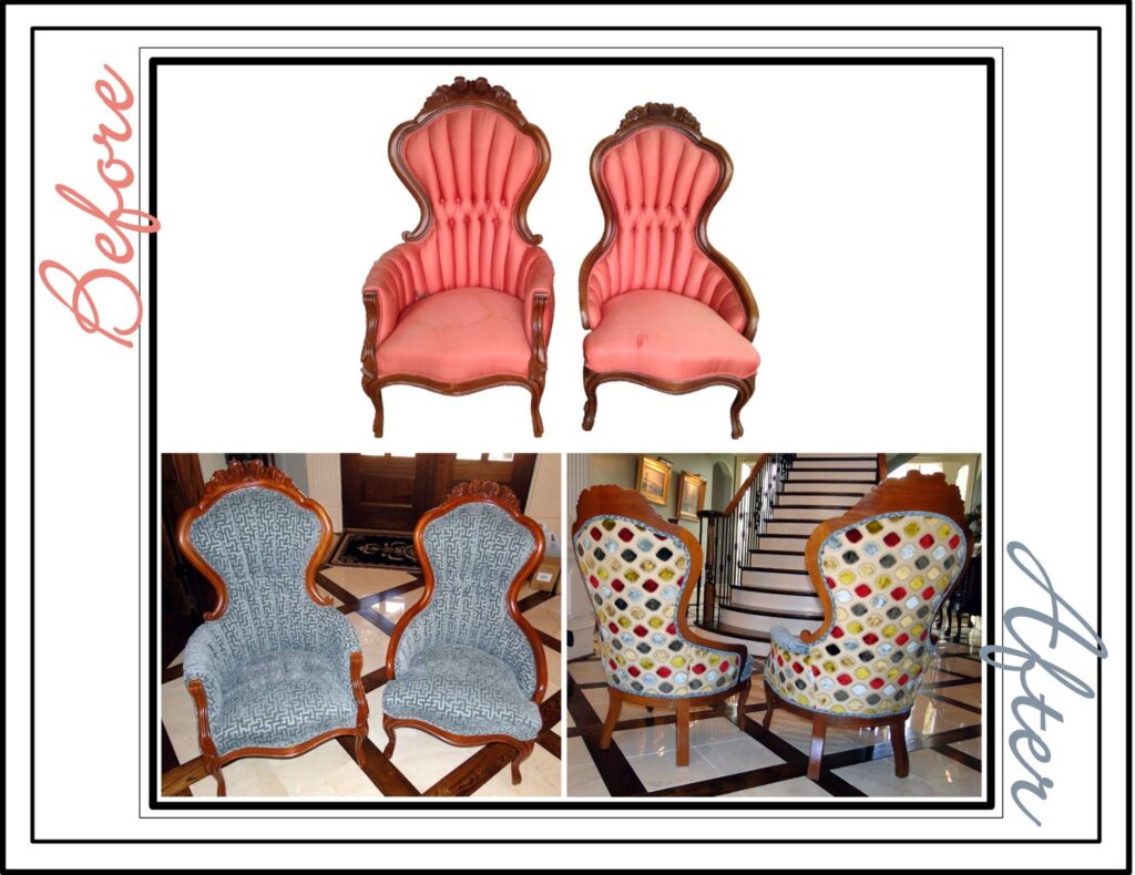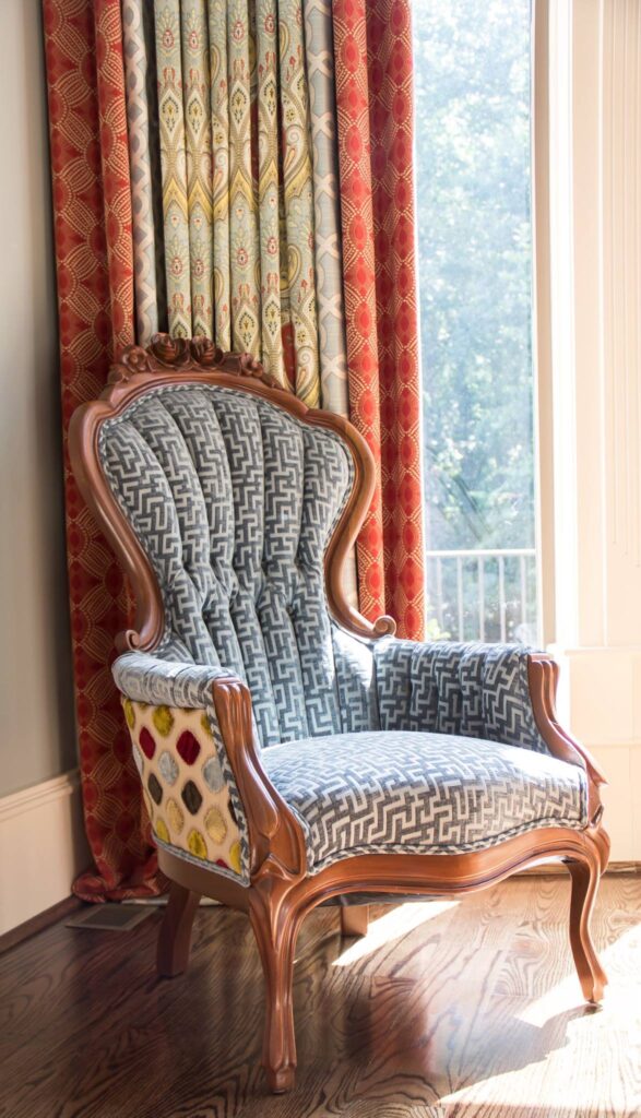 To complete the room, we also reupholstered family heirloom antique chairs in coordinating fabrics, breathing new life into meaningful pieces while tying the entire space together.